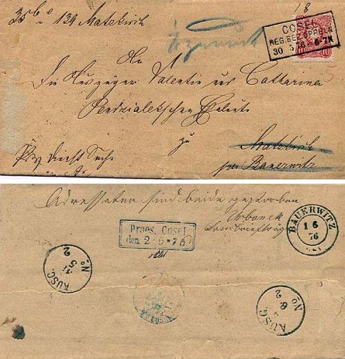 Brief von Cosel nach Matzkirch, gelaufen am 30.05.1876