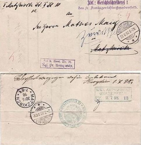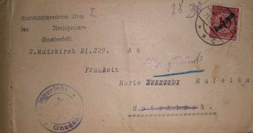 Brief vom Amtsgericht Gnadenfeld nach Matzkirch gelaufen am 21.11.1925