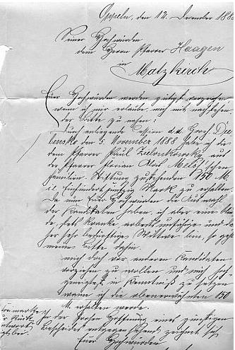 Ein "Bettel-Brief" aus Oppeln vom 12.11.1888 versendet an den Matzkircher