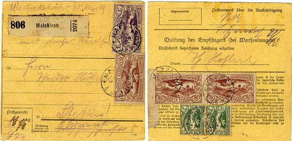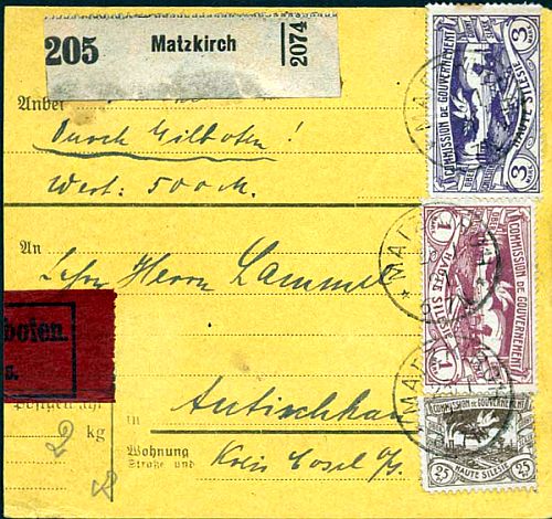 Matzkirch Paketkarte mit MiF 3 Mk. vs. und rs. frankiert.