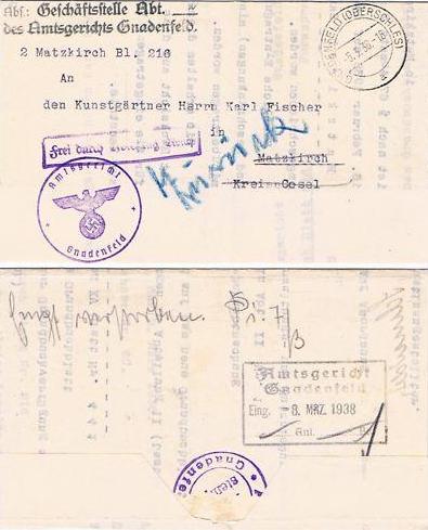 Dienstbrief (05.03.1938) vom Amtsgericht Gnadenfeld nach Matzkirch