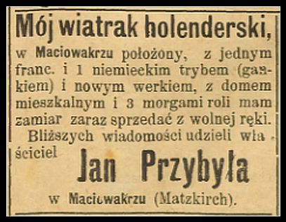 ist eine Anzeige über den Verkauf der Holländischen Mühle der Familie Przybyla aus Matzkirch zu finden.